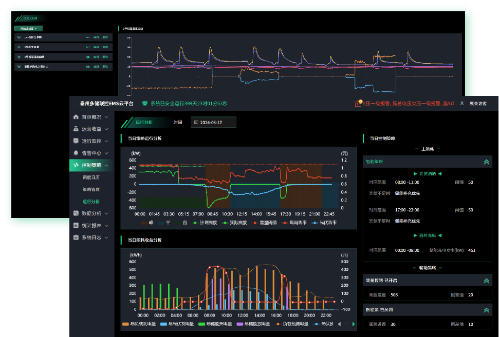EMS系統支持全面的場站能源控制策略,包括并網待機、循環充放、削峰填谷、光儲協同、離網備電、自定義策略、防逆流、防孤島運行、以及需量控制等。場站可以根據自身需求、當地電價策略以及實際生產用電情況,按天設置相應的控制策略。同時,系統支持連接云涌VPP運營管理系統,接收虛擬電廠平臺下發的需求響應策略并執行。