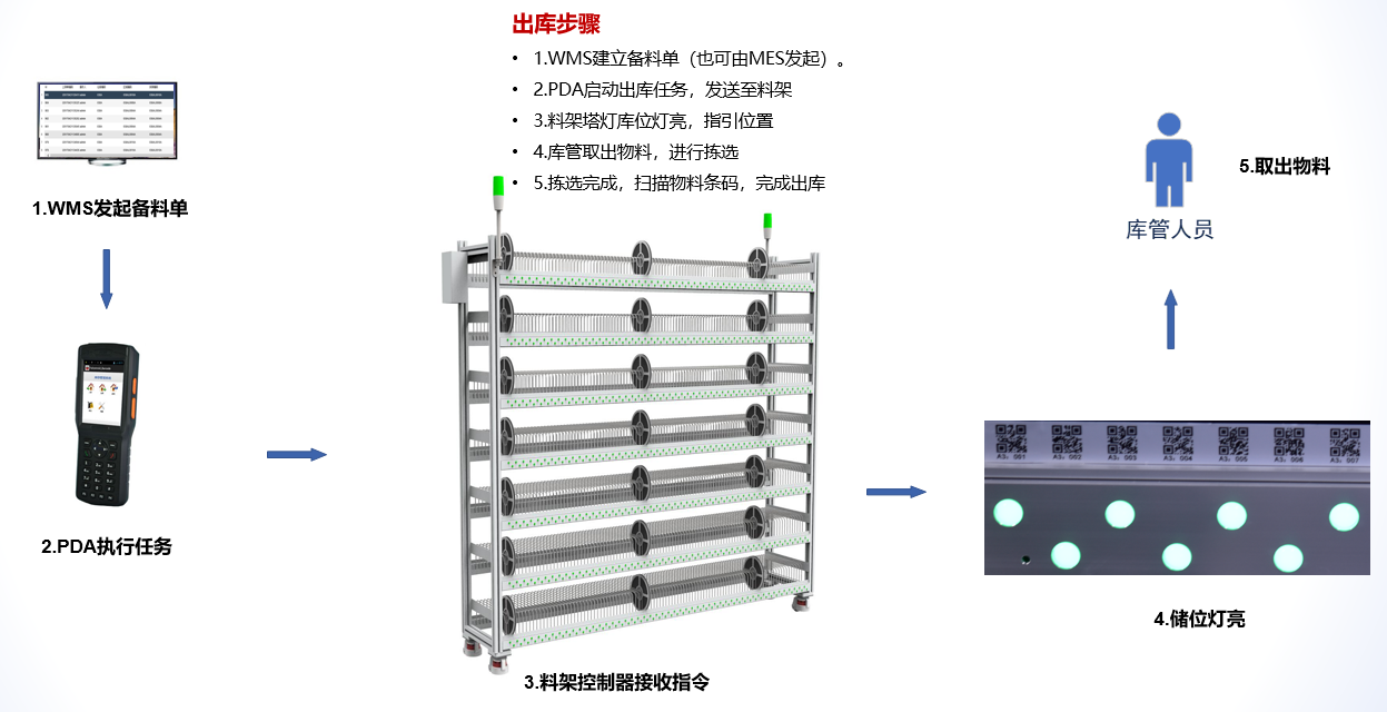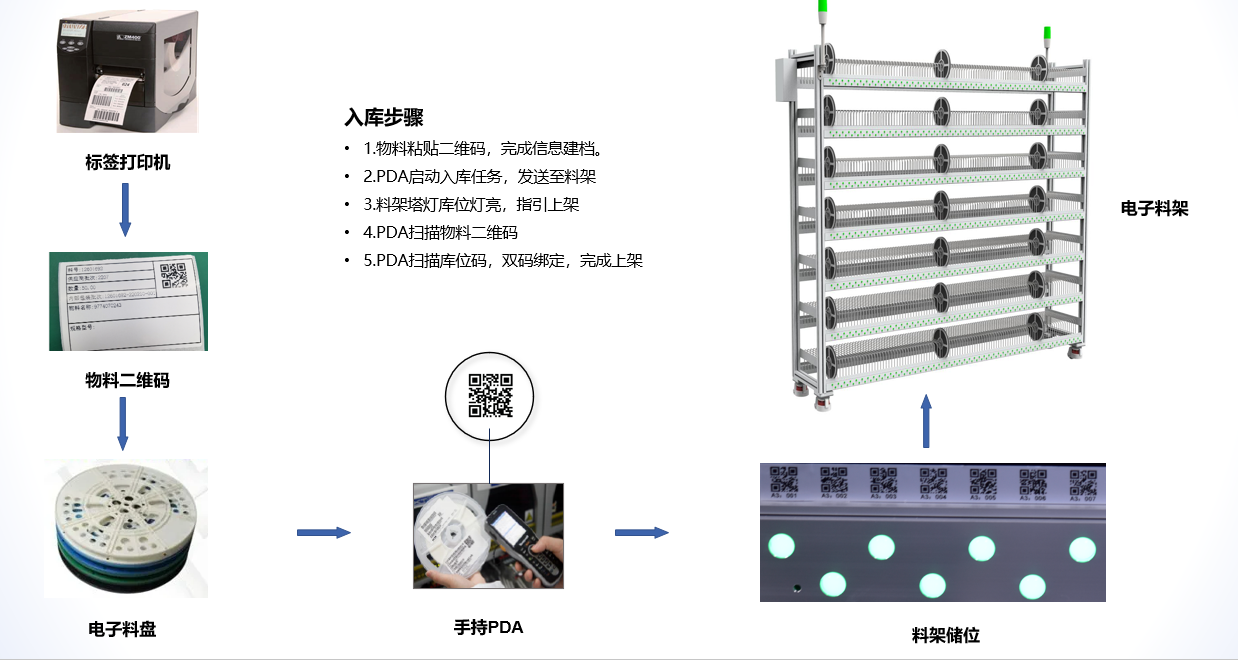 ? ? ? 對于SMT原材料使用電子料盤為存放單元,使用智能電子料架作為存儲設(shè)備。