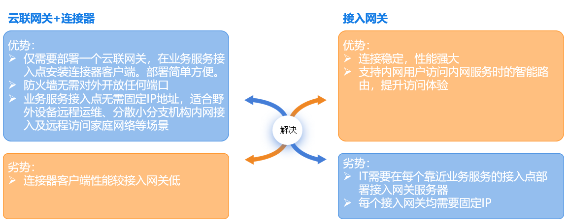 云涌遠(yuǎn)程辦公解決方案支持兩種內(nèi)網(wǎng)訪問(wèn)模式:基于接入網(wǎng)關(guān)的訪問(wèn)代理,以及基于云聯(lián)網(wǎng)關(guān)+連接器的內(nèi)網(wǎng)穿透。客戶(hù)可以根據(jù)自身IT架構(gòu)及實(shí)際需求選擇適合的服務(wù)訪問(wèn)模式。兩種模式可以同時(shí)存在。