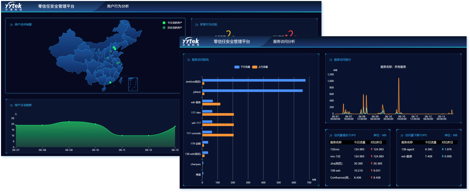 方案提供了用戶(hù)使用行為的態(tài)勢(shì)分析以及服務(wù)訪問(wèn)態(tài)勢(shì)分析,通過(guò)態(tài)勢(shì)大屏展示方便日常管理及領(lǐng)導(dǎo)審閱。