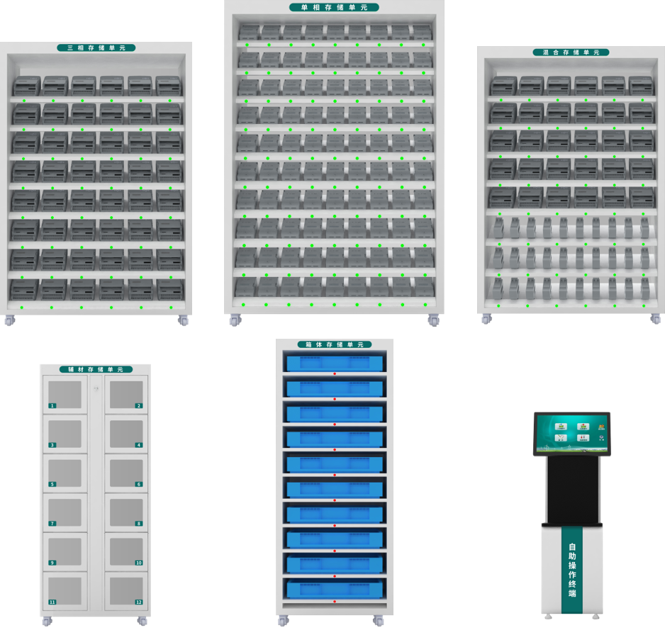 在設備方面,可提供單相存儲單位、輔材存儲單元、混合存儲單元、三相存儲單元以及箱表存儲單元等,根據庫房實際情況按需組合,存儲單元的多樣性,極大地滿足了現場空間的使用需求。而且結合智能操作終端的使用,一線業務人員在領用、存儲計量資產時,只需在終端上點擊工單,相應周轉柜儲位便會自動點亮,并伴隨語音播報,快速引導人員完成相關業務操作,極大提高了一線業務人員的工作效率。