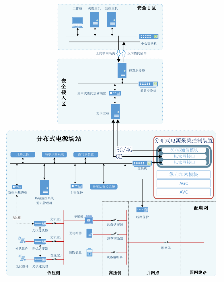???該裝置部署于分布式電源場站側,基于無線專用通信網絡架構,集成縱向加密單元、無線通信模塊及 AGC/AVC 控制功能,通過電力專用通信通道接入生產控制大區安全接入區,與調度主站建立安全通信鏈路,實現數據傳輸的可靠性與安全性。