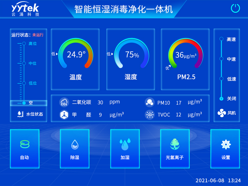 ? ? ? 此外,云涌智能恒濕消毒凈化一體機還具備智能化、人性化、直觀化的運行方式及操作體驗,運用微電腦智能控制技術,全中文液晶觸控屏,功能模塊化設計等,搭配遠程監控系統,實時智慧感知分析預制故障;同時,設備自身配有大容量的內置雙層水箱,實現雙重防漏保護,結合配備的缺水、水滿、溢水漏水報警系統,用戶可通過人工加水和自動加水兩種可選方式,使整個設備在使用過程中更加安全便捷。